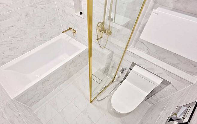 아이보리 비앙코 타일에 무광 골드 수전, 골드 프레임의 샤워 파티션을 적용해 고급스러운 공간을 연출했다. 욕실 밖에는 간이 세면대 겸 파우더룸을 배치했다.
