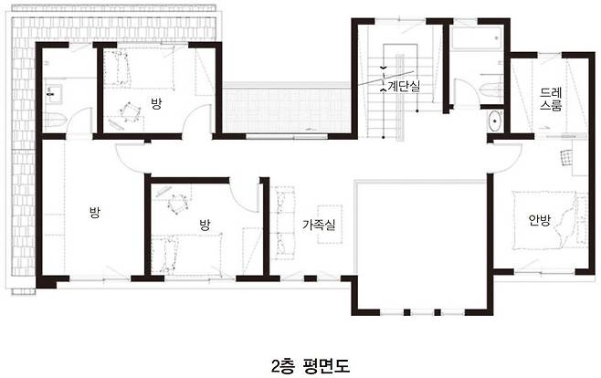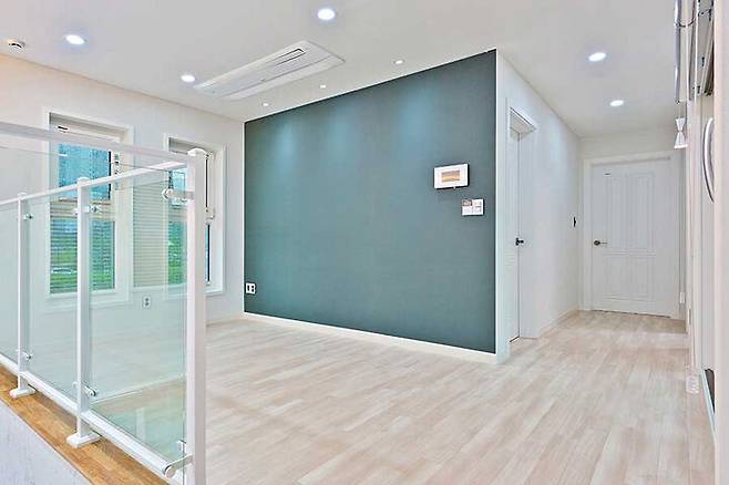 가족들의 대화 공간으로 꾸민 2층 가족실은 다크 그린 컬러의 벽지를 적용해 다소 밋밋해 보일 수 있는 공간에 포인트 줬다. 2층 계단 난간은 투명 강화유리를 사용해 더욱 개방감이 느껴진다.