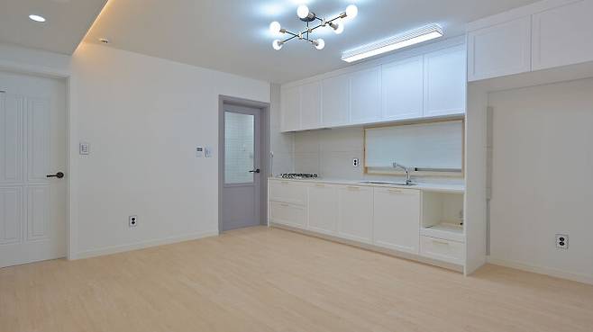 주방과 거실은 공간을 구획하지 않고 일체형으로 구성했다. 주방가구는 화이트 컬러 도장을 적용해 공간이 넓어 보이는 효과를 주었으며 몰딩이 들어간 고급스러운 가구를 배치했다.