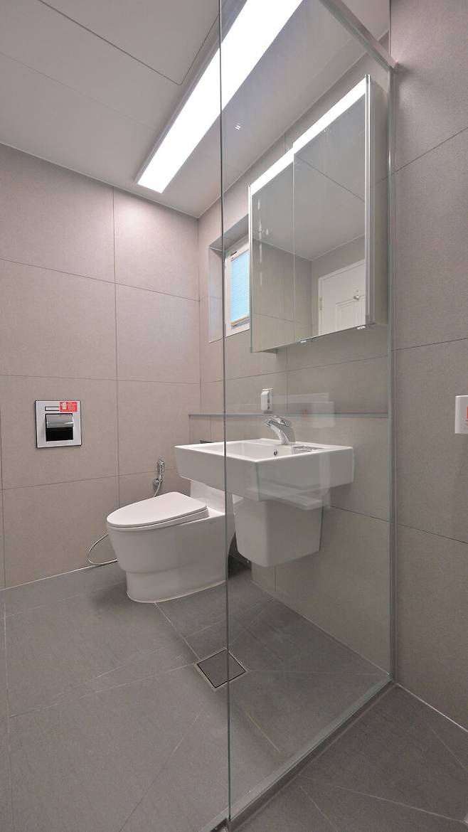 바닥 단차를 이용해 습식공간과 건식공간을 분리하고 벽과 바닥 타일에 통일감을 주어 모던하면서 깔끔한 공간을 연출했다. 바닥과 벽은 포세린 타일로 마감했다.