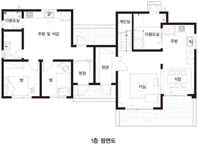 같은 집에 사는 두 가족은 서로의 보살핌이 필요하지만, 적당한 거리는 유지하기 원했다. 밖에서 보면 한 가족이 사는 한 채의 단독주택이지만, 안을 들여다보면 부모님과 자녀 세대가 분리되어 있는 두 채의 주택이길 바란 것. 이 주택은 서로 다른 두 가족이 사는 듀플렉스 주택과는 다르다. 내부 구조와 면적, 인테리어 요소를 들여다보면 그 차이를 알 수 있다. 이 주택의 부모님 댁과 자녀 세대는 비슷하지만 다르고, 서로 다르지만 결이 같도록 표현했다.