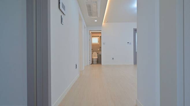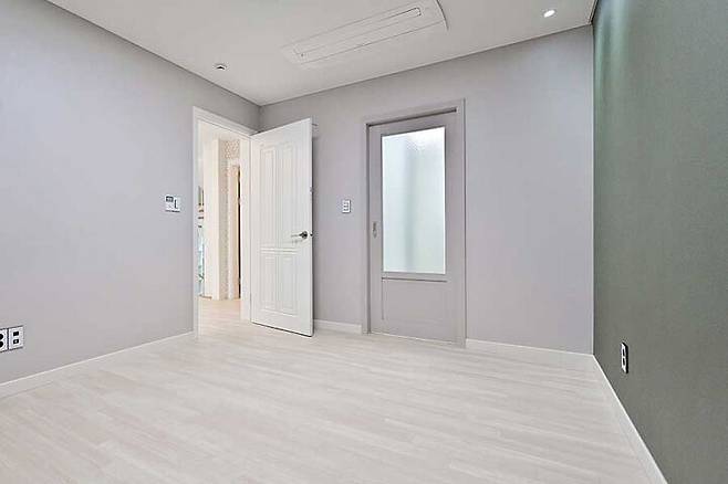 부모님 댁과 자녀 세대 모두 바닥은 강마루를 선택했다. 부모님 집은 아이보리 컬러(구정마루)를, 자녀 세대는 모던 바닐라크림 컬러(구정마루)로 마감했다. 벽체도 두 세대 모두 실크벽지(LG하우시스)를 사용했으며 색상만 차이를 두었다.