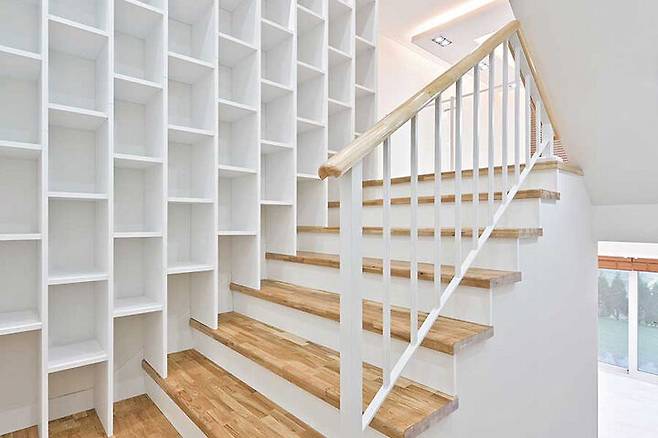 계단 층층마다 책장을 만들었다. 아이들이 이동하면서 책을 가까이에 두고 읽을 수 있도록 건축주의 아이디어로 완성된 공간이다.
