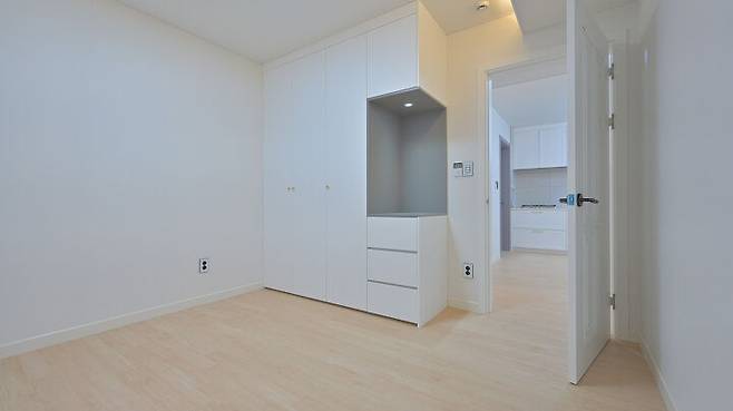 붙박이장에 화장대를 같이 적용하여 공간의 실용성을 더했다. 창틀에는 원목을 사방으로 돌려서 더욱 따듯한 느낌이 들도록 연출했다. 방문은 나무결이 있는 화이트 컬러로 선택했다.