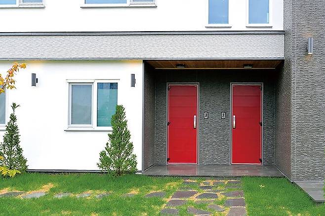 여느 주택과 다를 바 없는 외관의 단독주택이지만, 가까이 들여다보면 두 개의 현관문이 눈에 띈다. 나란히 배치돼있는 빨간색 문은 이색적이기까지 하다. 두 세대 생활이 완전히 분리되기도, 때로 공존하기도 한다는 것을 표현하는 장치기도 하다.