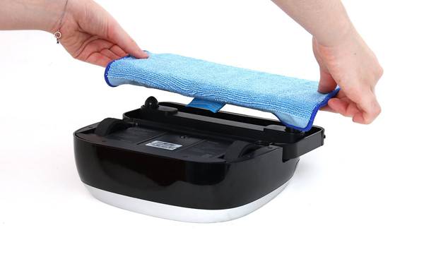 이 장치 뒤에 물걸레 판을 자유롭게 탈착할 수 있으며, 자석 형태로 되어 있어 누구나 쉽고 간편하게 사용할 수 있다. 이 물걸레 판은 총 3개가 제공된다. 구성은 건식 걸레 1개, 습식 걸레 2개이며, 건식 걸레의 경우 물결 모양으로 나 있는 고정 틈새에 걸레를 끼우기만 하면 되고 습식 걸레는 물걸레 판에 장착돼있는 벨크로에 걸레를 붙이기만 하면 된다. 물론 습식 걸레를 사용하기 위해서는 마른 걸레를 부착하더라도 상관없다. 물걸레 판 자체에 물을 넣을 수 있는 공간이 있어, 자연스럽게 습식 청소가 가능하다. 걸레가 부착된 물걸레 판을 마미봇 로봇청소기의 바퀴가 아닌 또 다른 2개의 다리에 구멍을 맞춰 자연스럽게 대면 안정적으로 달라붙어 본격적인 청소 준비가 마무리된다.