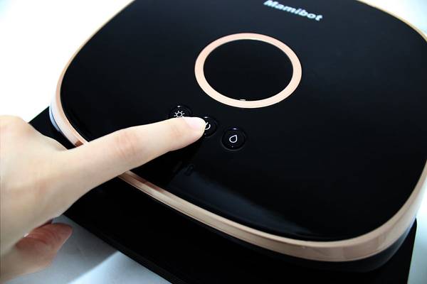 3개의 버튼은 가운데 전원 버튼, 그리고 왼쪽에 태양 모양의 버튼과 오른쪽에 물방울 모양의 버튼이 나란히 자리하고 있다. 마미봇 로봇청소기의 기능이 이 버튼만 보고도 알 수 있다. 태양 모양의 버튼은 건식 청소 시에 사용하는 버튼이며, 물방울 모양의 버튼은 습식 청소 시에 사용하는 버튼이다. 그렇다. 마미봇 로봇청소기는 물걸레 로봇청소기다. 그래서 마미봇 로봇청소기를 아무리 살펴봐도 먼지 흡입구가 없다.