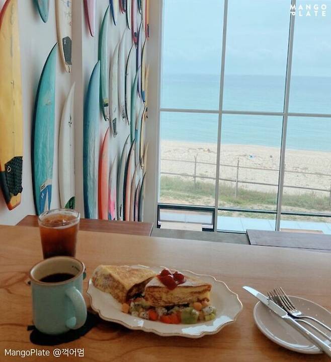 층별 인테리어 느낌이 조금씩 달라 보는 재미가 있어요. 그중에서도 이렇게 서핑보드를 벽면에 붙인 이 공간은 누가 뭐래도 포토스폿! 오픈 시간에 맞춰가면 손님 없이 나 홀로 이 공간을 독차지할 수 있어요. 인생 샷은 덤! 이렇게 바다를 바라보는 방향으로 계단식의 좌석들이 쫙 깔려있는데요. 그냥 앉아 있는 것만으로도 힐링이 돼요.