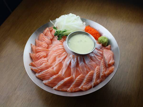 보통 연어 한 가지만 무한으로 먹을 수 있는 곳과 달리 이곳에서는 슈페리어 등급 연어 사시미를 포함해 다양한 메뉴가 결합된 세트가 잘 되어 있다. 특히 생연어 사시미와 크리스피 치킨 세트는 해물 부추전과 수제 치즈 샐러드가 함께 제공되어 자칫 질릴 수 있는 입맛을 여러 메뉴가 돌아가면서 바꿔주기 때문에 정말 푸짐하게 즐길 수 있다. 리필 시 제공되는 연어 역시 처음 나올 때와 같은 슈페리어 등급만 제공되고 있으며 원하는 부위가 있다면 따로 요청해도 좋다.