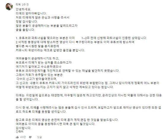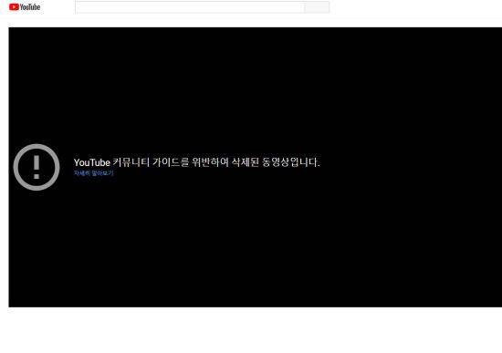 그러나 이 영상은 얼마 되지 않아 채널에서 사라졌다. “유튜브 커뮤니티 가이드를 위반해 삭제된 동영상”이라는 설명이 적혔다.