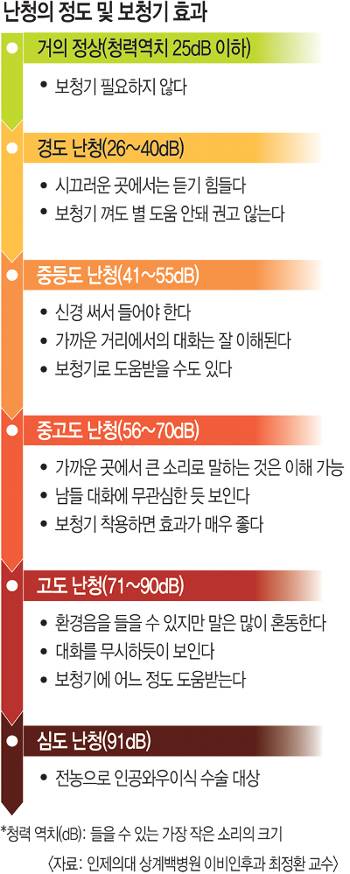 중등도 이상 난청은 TV 볼륨이 점점 커지고 대화할 때 상대방의 말을 자꾸 되묻게 되며 무의식적으로 상대방의 입모양을 보게 되는 경우 해당된다. 최 교수는 “청력 역치가 56~70dB인 경우 보청기 착용 효과가 가장 좋다. 아울러 청력검사에서 단어 분별력(어음 인지도)이 50% 이상 돼야 보청기 만족도가 높다”고 덧붙였다. 청력 역치가 71~90dB의 고도 난청인들은 어음 인지도가 50% 미만으로 낮아서 보청기를 껴도 만족도가 낮을 수 있다.