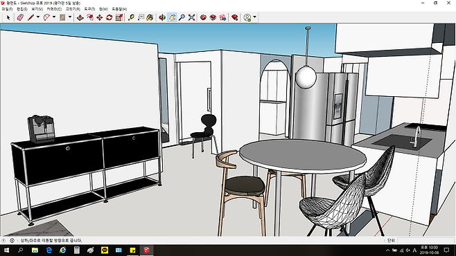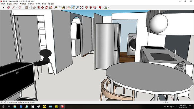 허접하긴 하지만, 인테리어 공사 시작 전 몇 년 전 대충 배운 스케치업으로 가구 배치와 바꿀 구조를 구성해보았어요. 이 프로그램을 돌렸던 가장 큰 이유는 냉장고를 기존 자리에서 이동해야 하는데, 싱크대와의 거리, 그리고 식탁이 냉장고 자리에 들어가야 하는 것을 고민해보기 위해서였어요.