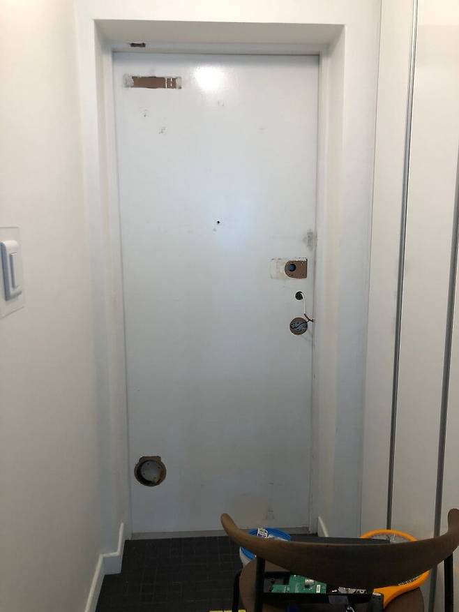 현관 시공 전과 후에요. 때 탄 현관문의 부속품을 다 떼내고 필름지로 깔끔하게 시공했어요.
