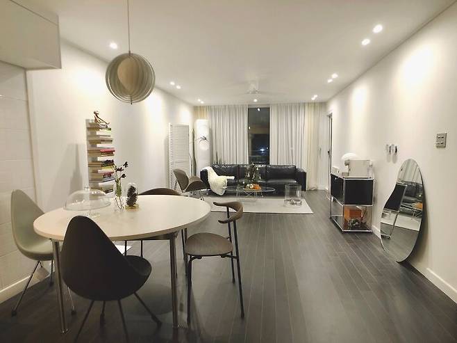 "고민 끝에 TV를 안방으로 옮기고 소파는 창을 등지게 하여 외국의 스튜디오 느낌을 내보려고 노력하였습니다"