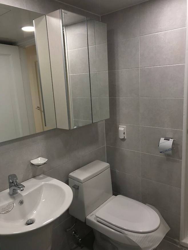 이것이 2년 전 수리했던 화장실 비포사진. 남편이 다행히 어디서 본 게 있어 무광 회색으로 해달라고했다는데 덕분에 톤은 괜찮아서 세면대, 거울장만 폭파시키고 샤워파티션 + 타일은 살릴 수 있게 되었어요.
