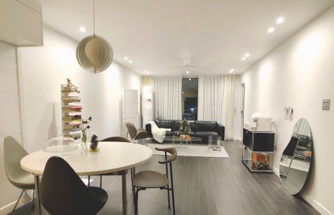 수납을 포기할 수 없어 천장 쪽 냉장고장을 살려 놓긴 했지만, 다행히 화이트 타일이 여전히 깨끗해서 식탁을 놓아도 어색하지 않았습니다. 그리고 벽을 철거하면서 선정리를 하여 비교적 원하는 느낌을 낼 수 있었어요.