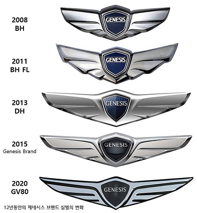 제네시스 브랜드 역시 그러한 아이덴티티 전략을 쓰고 있다고 할 수 있다. 브랜드 독립은 2015년에 이루어졌지만, 제네시스 이름과 심벌은 2008년의 BH세단 등장과 함께 제시됐다. 그 뒤로 작년까지 12년동안 심벌이 다섯 번 정도 변화를 겪은 걸로 보인다. 그런데 그게 이전의 것을 완전히 갈아 엎는 식의 변화가 아니라, 조금씩 다듬는 방법으로 계속 진화해온 모습을 보여준다. 그런데 그 변화의 폭이 한데 모아놓고 보면 의외로 적지 않다.