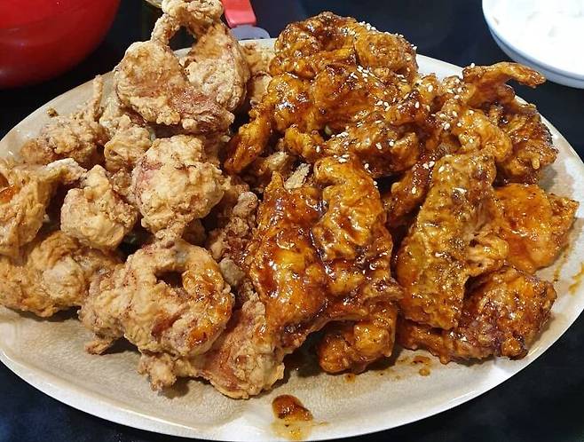 ▲후기(식신 꼬마벌레): 생활이 달인에 출연한 통닭집이에요~ 근처에 자동차 공장이 있어서 금방 만석이래요~ 켄터키랑 양념 반반 주문했어요~ 여기는 통닭이 조각조각 잘려 나와요~ 튀김옷이 얇고 무척 고소해요~ 양념은 달달하고 매콤~ 개인적으로 켄터키 소금에 찍어 먹는 게 젤 맛났네요^^
