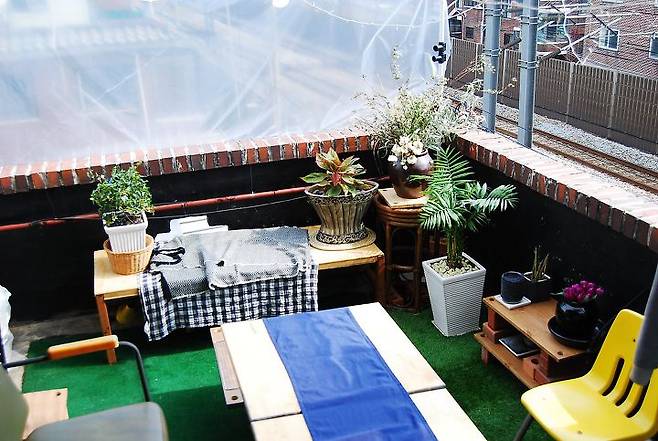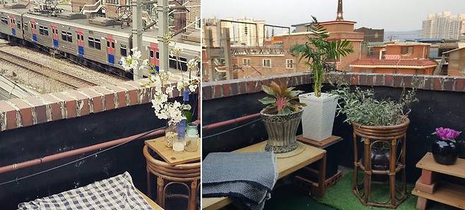 처음 독립을 생각했을 때부터 옥탑에 대한 로망이 있었어요. 옥탑을 구할 때 가장 중요하게 생각한 부분이 옥상 공간을 나만 쓸 수 있냐는 것과 안전인데요. 현재 살고 있는 이곳은 둘 다 만족하는 조건을 갖춘 곳이었고, 아늑한 테라스 사이즈도 꼭 마음에 들었어요. 그리고 건물들이 너무 가깝게 붙어 있지도 않았고, 앞에 전철이 다니고 있어 시야도 뻥 뚫려 있었죠.