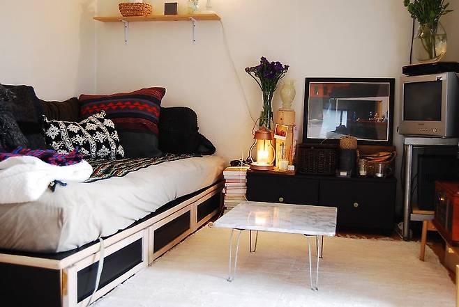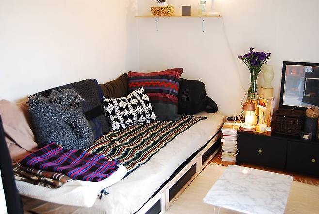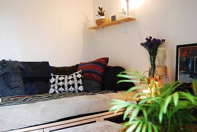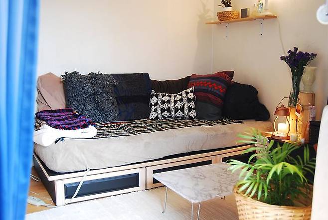 친구들이 집에 놀러 오는 날엔 침대를 소파로 바꿔서 사용해요. 러그를 침대에 깔아주고 쿠션을 정렬하면 훌륭하고 멋진 소파가 완성된답니다.