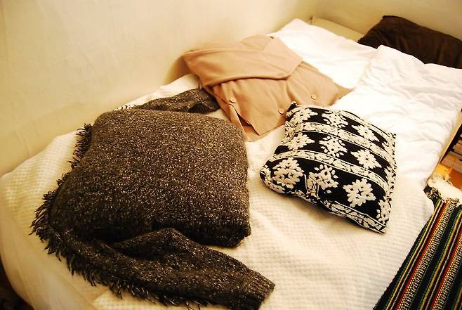 주로 침대는 이런 모습이에요. 호텔식 침구에 대한 로망이 있어서 한번 스타일링해봤어요. 배게를 등받이 쿠션처럼 사용하기도 하고 여러 용도로 쓰고 있어요. 하얀 이불은 저렴하게 4만원 주고 인터넷에서 구매했고, 쿠션은 제가 직접 다 만든거예요. 주로 안 입는 겨울 옷들을 활용했어요.