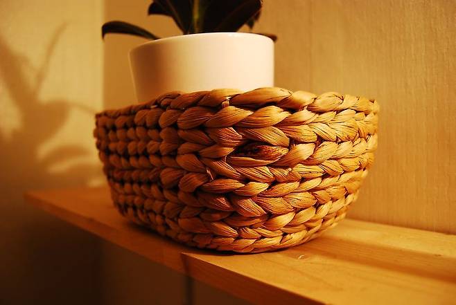 저는 주로 수납을 하거나 소품들을 꾸밀 때 라탄 느낌이 나는 바구니를 자주 애용하는데요. 화분도 바구니에 넣어주면 더 따뜻하고 아늑한 느낌이 나고, 자연 친화적인 느낌이 들어 편안해지는 기분이 드는 것 같아요.