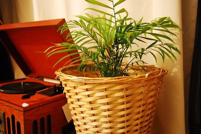 여기는 10평도 안되는 저희집에서 제가 가장 좋아하는 곳이에요. 바로 제가 사랑하는 턴테이블과 라탄 바구니에 담긴 테이블 야자가 있는 현관 앞입니다. ^^
