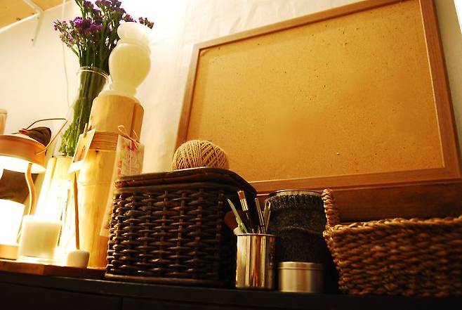 캔들워머 : 더캔들 앤티크 캔들워머 / 테이블시트지 : 문고리닷컴 마블 대리석시트지 마블그레이 / 라탄화분 : 다이소