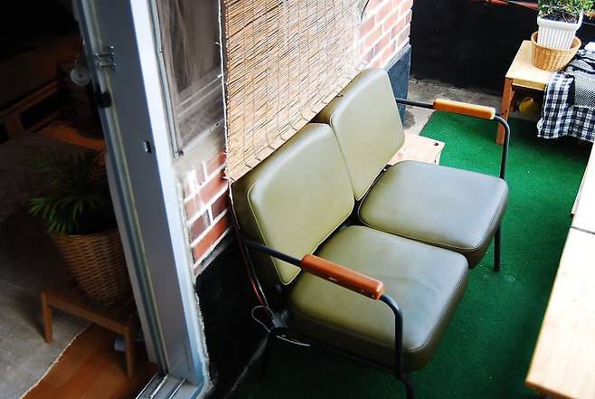 테라스로 나가면 바로 야외 소파가 있어요. 옥탑 공간은 저만 사용하기 때문에 바닥에 잔디매트를 깔아두었어요. 날씨가 좋은 날엔 소파에서 노트북도 하고 책도 보고 커피도 마시면서 뒹굴 거리며 시간을 보내곤 해요.