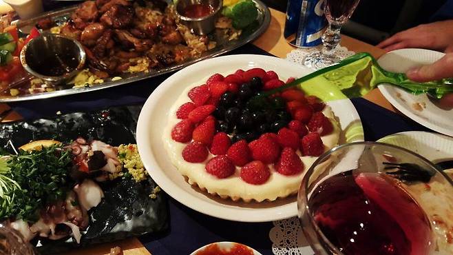 4월 홈파티는 낭만적으로 꾸미고 싶어 요리 솜씨를 좀 발휘해 보았습니다. 파티와 어울리는 음식들에다가 샹그리아도 담그고 생일인 친구를 위해 타르트까지 만들었답니다. 자취 4년에 요리 실력만 엄청 늘은 것 같아요. 워낙 요리를 좋아하기도 했고요. ^^
