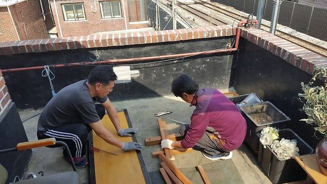 벤치 위에 앉기도 하고 화분을 올려놓기도 하고 여러 용도로 사용하고 있어요. 버린 문짝을 이용해 만든거라 제작비는 0원입니다. 캬하~