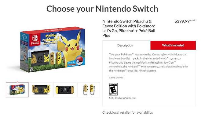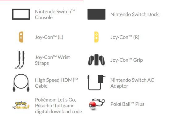 특별판의 구성품으로 피카츄와 이브이의 그림이 들어가 있는 본체와 충전독, 각 캐릭터별 컬러를 채택하고 있는 조이콘, 그리고 기본 구성품과 렛츠고 피카츄 다운로드 코드와 포켓볼 플러스가 포함되어 있습니다. 만약 렛츠고 이브이 버전을 선택했다면 렛츠고 이브이 게임 다운로드 코드가 포함된다고 합니다.