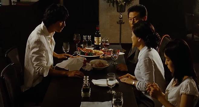 철수와 수진이 저녁을 먹다가 결국 수진의 계획(?)으로 그녀의 가족들과 마주하게 된 장면.