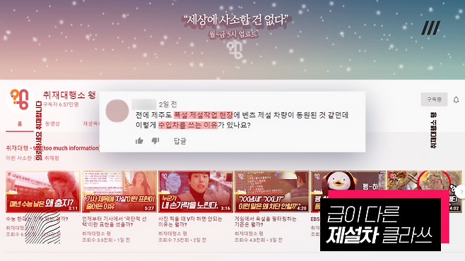 유튜브 댓글로 “얼마 전 제주도에 눈 내렸을 때 벤츠가 제설작업 하는 걸 봤는데 왜 국가 기관이 국산차 안 쓰고 벤츠를 쓰는지 알아봐 달라”는 의뢰가 들어와 취재했다.