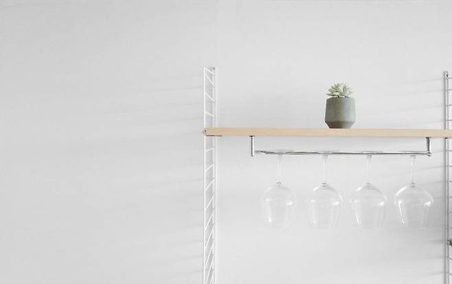 첫 번째 신혼집에서 사용하던 가구를 최대한 활용하면서 미니멀한 거실을 만들기 위해 스트링 선반 하나당 필요한 필수 제품을 하나씩만 두어 스타일링 했습니다.