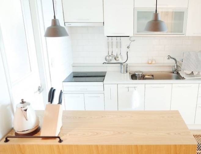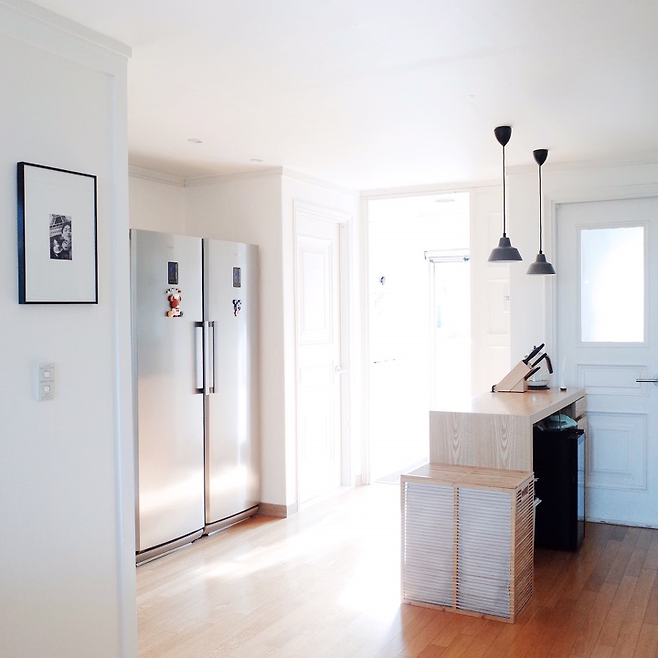 작은 주방이지만 칼 세트 외에 아무것도 없는 아일랜드 테이블 하나로 요리가 불편하지 않고 편해졌습니다. 뿐만 아니라 심플한 디자인의 작은 냉장고는 냉장고도 스타일링 요소로 활용할 수 있으면서 식재료를 과소비하지 않게 해주었죠.