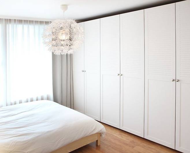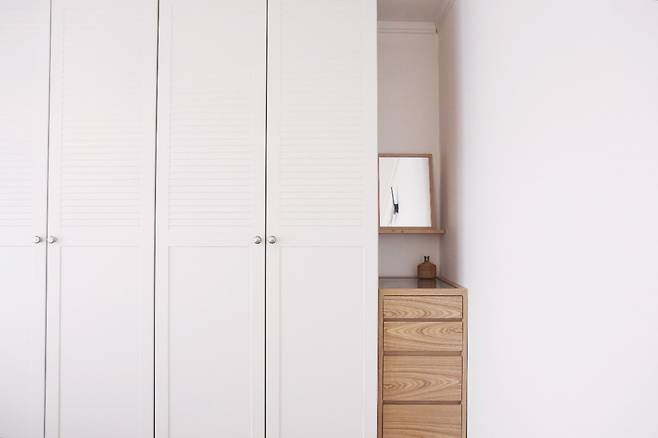 안방 한쪽 공간에는 옷을 정리할 옷장과 서랍장을 마련하였습니다. 넓어 보이는 효과를 주기 위해 화이트 색상 옷장을 선택하고 틈새 공간에 알맞게 맞춤 제작 서랍장을 두었습니다.