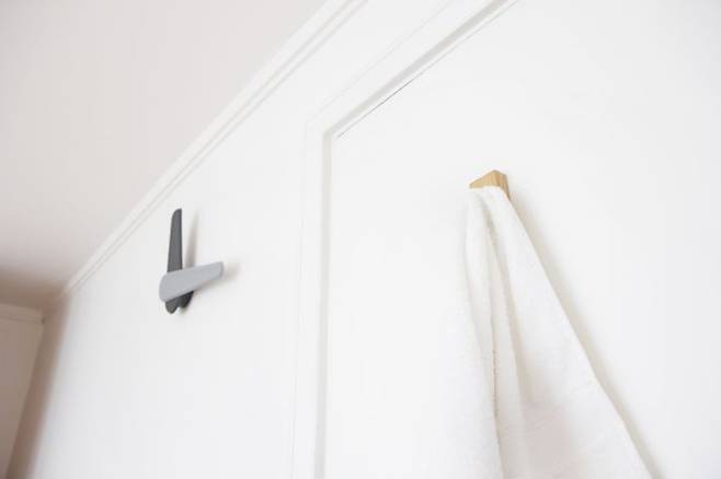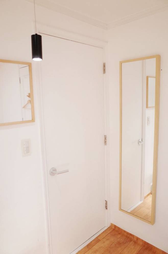 안방 문 뒤에는 잠옷을 걸어놓을 수 있는 벽행거를 설치하였습니다.
