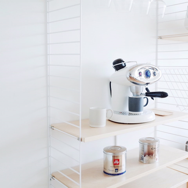테이블 : 예딤가구 / 조명 : 까사인루체 / 선반 : 스트링(이노메싸) / 커피머신 : 일리 / 스피커 : B&O / 티슈케이스 : 코코로박스 / 의자: 노먼코펜하겐(이노메싸), HAY(이노메싸)