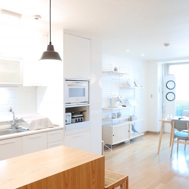 아일랜드 테이블: 맞춤제작 / 조명 : 이노메싸 / 칼 세트 : 헹켈 / 커피포트 : 드롱기 / 조리도구 : 휘슬러 / 햄퍼 : 까사미아 / 액자 : 에이모노