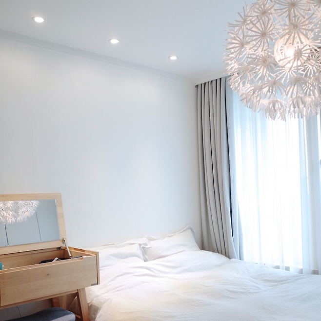 옷장 : 한샘 / 서랍장 : 맞춤제작 / 거울 : 무인양품 / 커튼 : 메종드룸룸 / 침구 : 왓디자인 / 사이드테이블 : 바이헤이데이 / 조명 : 이케아