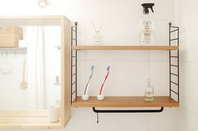 전세집 화장실이라 큰 변화를 주는 것은 어려웠기에 거울 첫 신혼 집에서 사용하던 거울과 선반을 그대로 가져와 달았어요. 부담스러운 사이즈의 선반장이 없으니 화장실도 훨씬 깔끔하고 넓어 보입니다.
