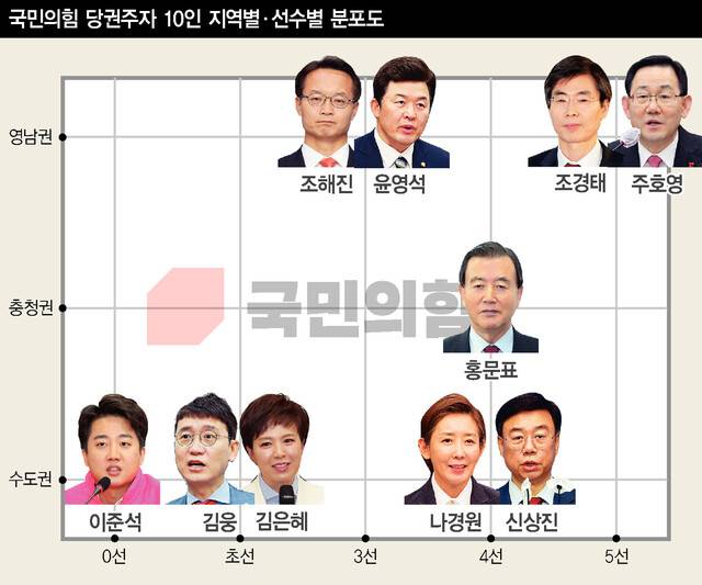 높은 인지도를 기반으로 일반 여론조사에서 국민의힘 당대표 지지율 양강 구도를 형성하고 있는 나경원 전 의원과 이준석 전 최고위원이 20일 출마를 선언하면서 10명이 나선 6·11 전당대회 대진표가 사실상 확정됐다. 이들은 저마다 자신이 ‘정권교체를 위한 적임자’라고 주장하지만, 각각 경륜과 개혁을 강조하는 등 서로 다른 방법론을 내세우며 세대 간 대결 구도가 뚜렷해지고 있다. 국회의원 경험이 전혀 없는 원외 30대(이준석)부터 영남의 60대 5선 의원(주호영)까지 다양한 경력의 정치인들이 당권 레이스에 뛰어들면서 어느 때보다 치열한 경쟁이 예상된다.