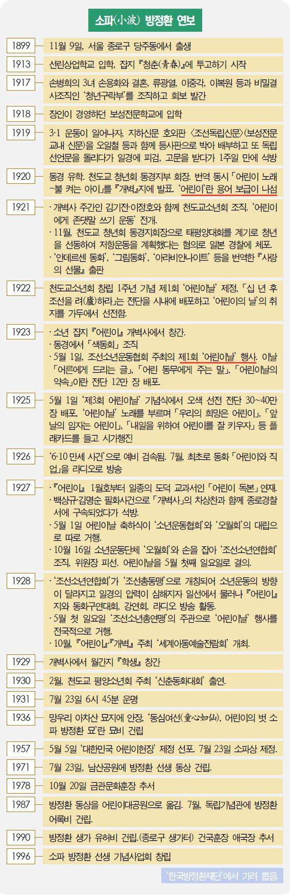 1921년 천도교소년회를 조직해 소년운동에 뛰어든 이래 십 년 동안 그는 이 나라 소년운동의 산 역사였다. 무엇보다 그는 유교 도덕에 얽매여 있던 어린이들을 독자적 존재로 자리매김하고 그들이 어린이다운 감성으로 살아갈 수 있도록 해방한 사람이었다.
