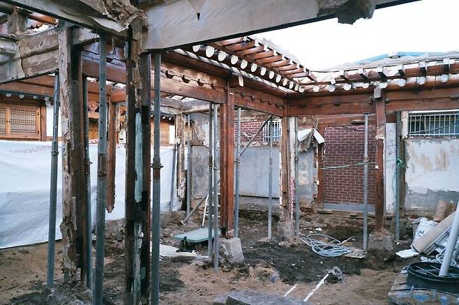 누운 집을 전체적으로 일으켜 세우는 한편 골조를 다시 만드는 과정을 거쳐야 했습니다. 그래도 1920-30년대에 조성된 북촌 한옥마을의 서민 주거형 한옥 치고는 흔치 않은 건축양식과 양호한 목재의 상태를 보고 도전해볼 만하다는 생각을 했습니다.