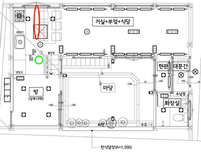 이제야 설계도면을 보여드리네요. 세탁기 위치는 달라졌지만 기본적인 구조는 같습니다. 앞서 설명한 것처럼 '거실+부엌+식당' 이 도면에 표현되어 있죠.