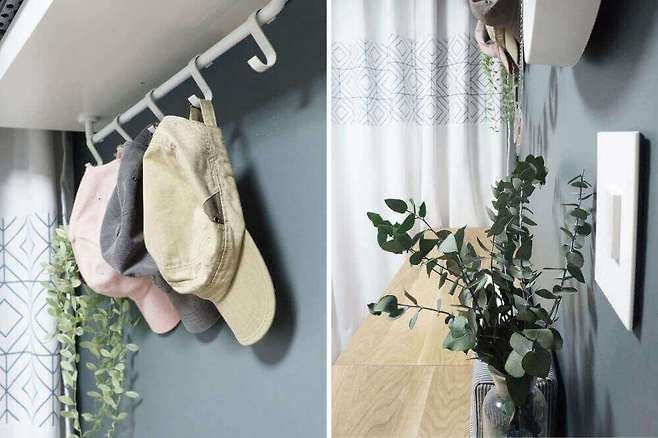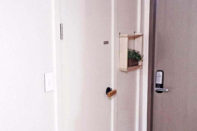 벽에 걸려있는 작은 선반은 제가 직접 만들었고요. 올려져 있는 초록이는 조화예요. 방문은 밝은 화이트 톤으로 모두 셀프페인팅해서 넓어보이는 효과를 주었어요.
