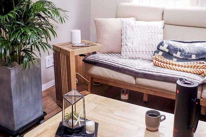 협탁 : MANUFAKUM PLY SIDETABLE MULTY-BLOCK / 블랭킷 : 잇츠디자인 크로스 블랑켓 / 극세사 쇼파패드 : 1300K 조이 극세사 쇼파패드 3인 / 머그 : 킨토 슬로우커피 스택 머그 / 보온병 : amart 체코 라마트 보온병 / 유리박스 : 오후's 마켓
