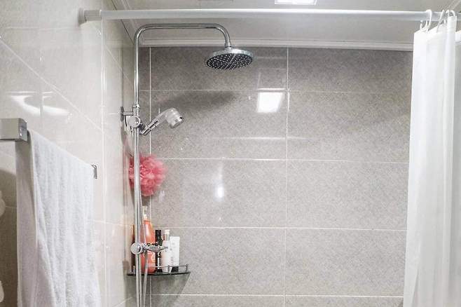 샤워 커튼을 걷으면 기본적인 욕실 모습이에요. 최대한 깨끗하게 그리고 빨리 건조되도록 관리하고 있어요.