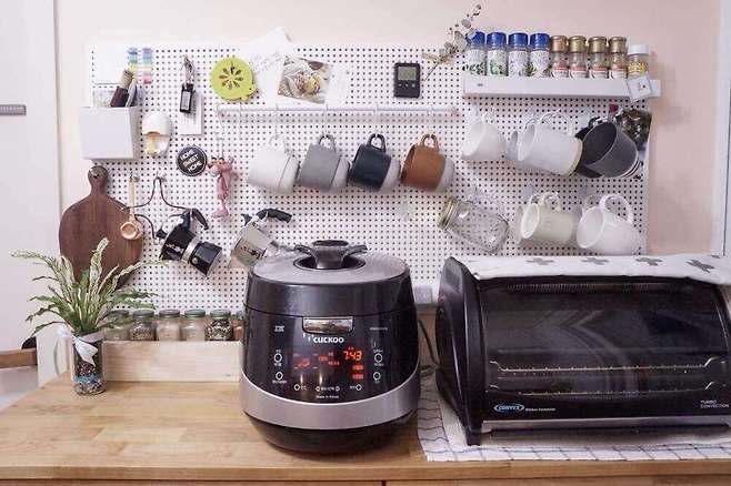 전기밥솥 : 쿠쿠 풀스텐 10인용 IH압력밥솥 / 전기오븐 : 컨벡스 L9282 / 타공판 : 문고리닷컴 타공판 인테리어 수납보드 Maxi / 월넛도마 : 제작 장스목공방 월넛도마 / 모카포트 : 비알레띠 모카 블랙 3컵 / 머그잔 : 킨토 슬로우커피 스택 머그